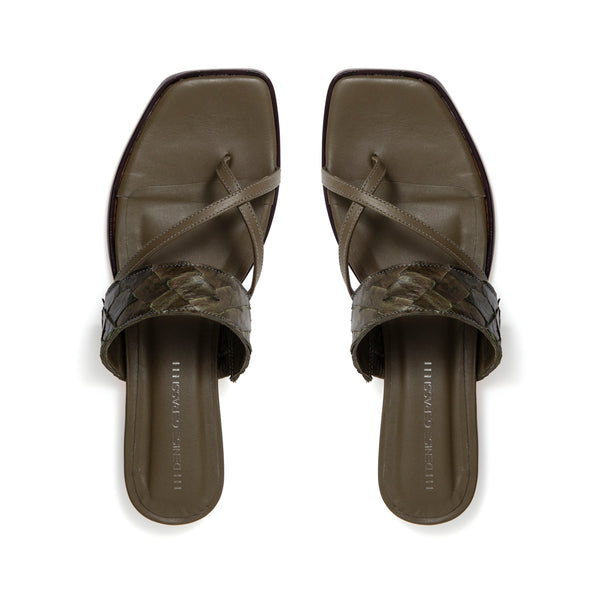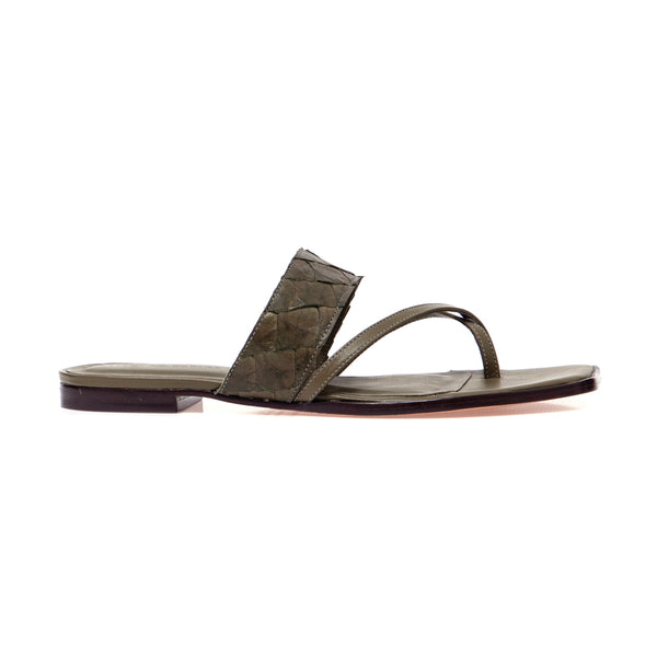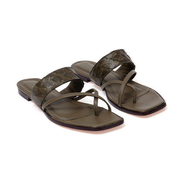 Açucena é uma sandália rasteira, tipo mule, com cabedal em tiras de pirarucu, palmilha e solado em couro bovino, recebe seus pés com elegância e delicadeza. É o modelo ideal para acompanhar vestidos casuais, longos ou curtos, shorts e calças pantalonas ou pantacourt. Incrementa o look despojado, com sofisticada simplicidade.