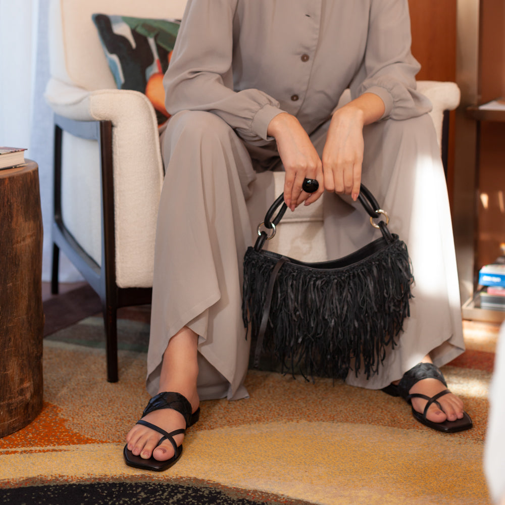 À partir da clássica Nanine, a nossa icônica bolsa de franjas que nasceu junto com a Marca Denise Gerassi, a Mini Nanine é feita em couro, com frente em franjas de couro de cabra trançadas manualmente.