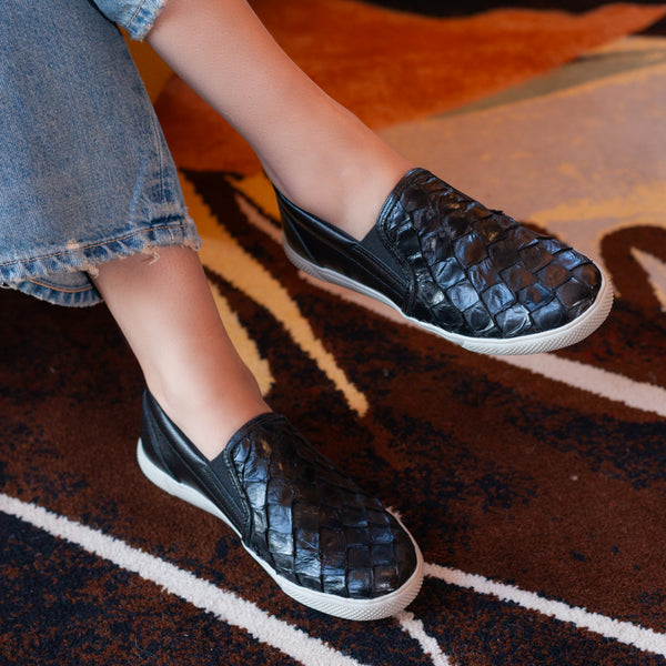 Uma proposta de conforto descomplicado, para quem precisa de praticidade e não abre mão de muito estilo. Feito em couro bovino com frente em nosso maravilhoso couro de pirarucu, é um belo tênis para fazer um passeio e até para eventos mais despojados.
