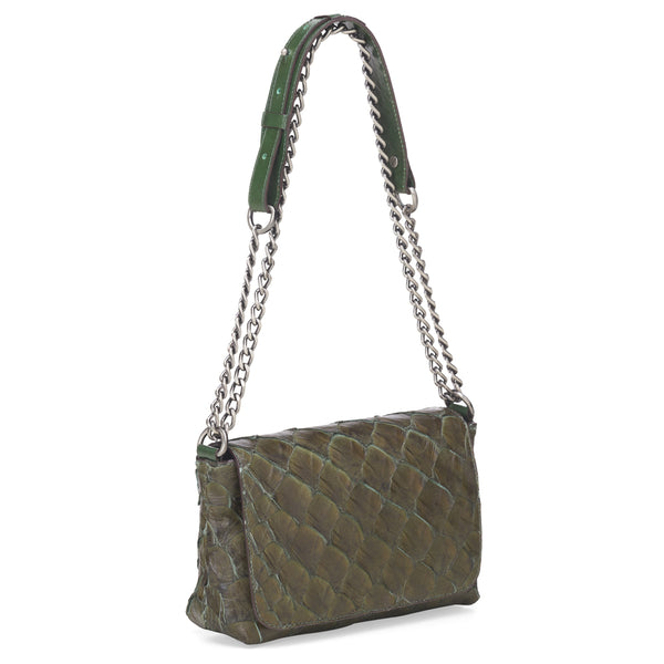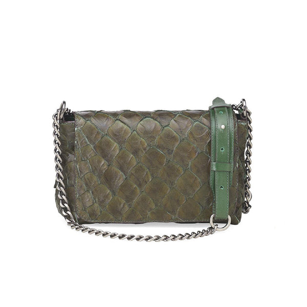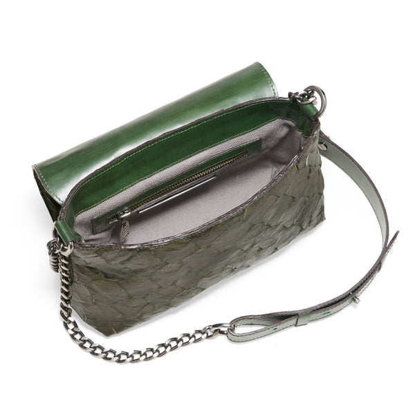 Ela é feita em couro de pirarucu, com uma tampa fechada por ímã e tem um shape clássico ao mesmo tempo que super atual. Diversas possibilidades de composições podem ser feitas com esta bolsa que virou um ícone Denise Gerassi.