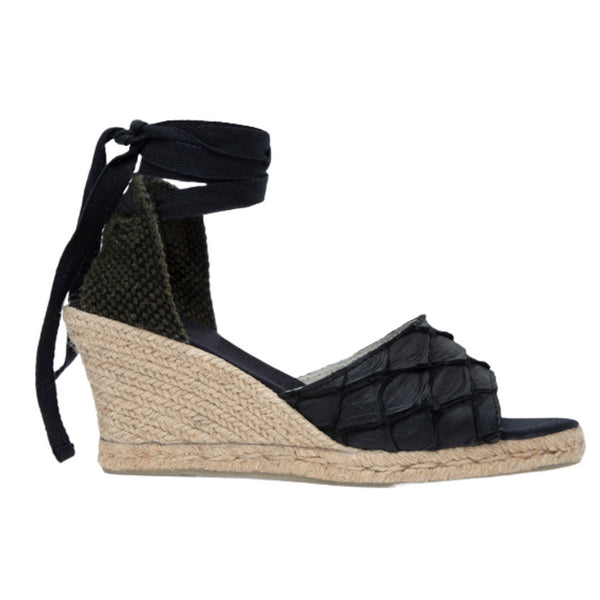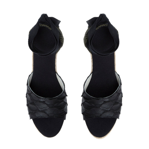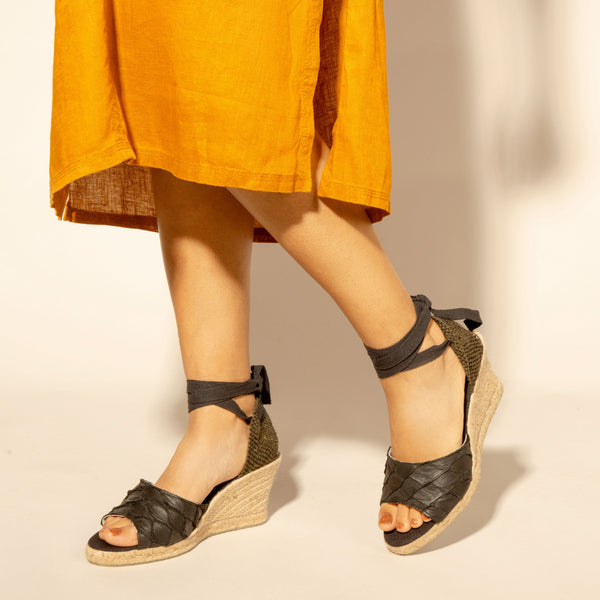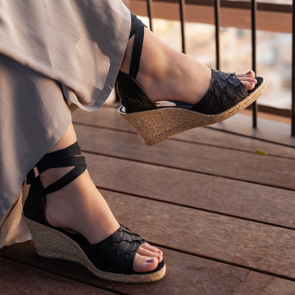 Confeccionada em lona de algodão e com frente aberta em couro de pirarucu, ícone da marca, a Vivá tem salto anabella de 7 cm, sola em corda e traseira em tear com fita de algodão para amarração no tornozelo.
