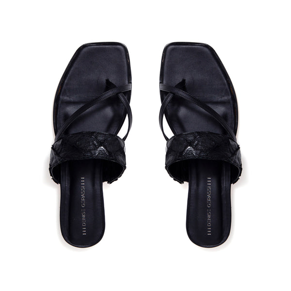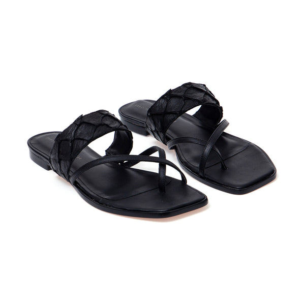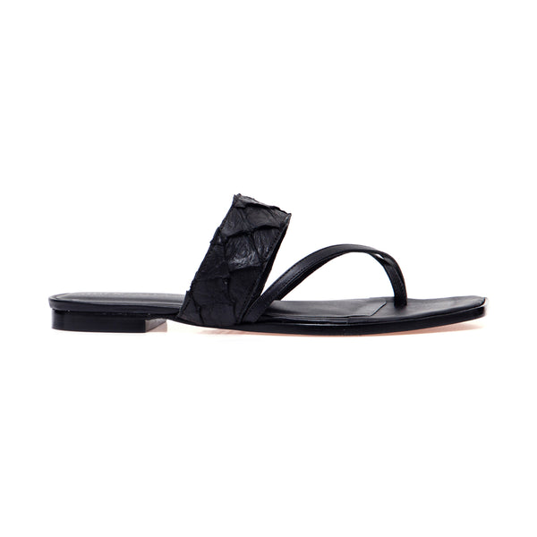 Açucena é uma sandália rasteira, tipo mule, com cabedal em tiras de pirarucu, palmilha e solado em couro bovino, recebe seus pés com elegância e delicadeza. É o modelo ideal para acompanhar vestidos casuais, longos ou curtos, shorts e calças pantalonas ou pantacourt. Incrementa o look despojado, com sofisticada simplicidade.