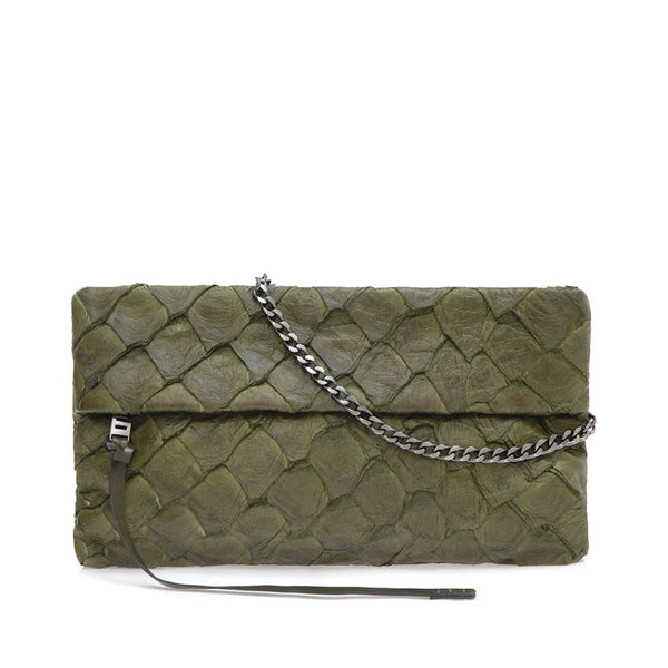 Toda em couro de pirarucu, acompanha 2 alças: uma em couro liso e outra em corrente no banho ônix.