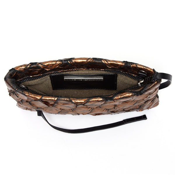 A versão compacta, mas nada básica, de nossa icônica Maxi Clutch: conheça a Mini Aquira. Ela é nada convencional, mas muito sofisticada e poderosa. A Mini Clutch Aquira é toda feita em couro de pirarucu, e te acompanha em casamentos ou festas, além de muitas outras ocasiões mais descontraídas. Por isso mesmo, é a versão mini de uma das bolsas de mão mais desejadas da nossa coleção. Agrega valor na combinação com tecidos sofisticados como seda, musseline, cetim, renda e até mesmo com peças bordadas. Pode ser usada, com classe e elegância, em muitos outros momentos. Cai muito bem com aquele jeans confortável, camisa e tênis, ou até com sandália esportiva… Prática, versátil, compacta e super charmosa. Acompanha 1 alça em corrente no banho ônix com 115cm de comprimento. Possui um bolso frontal externo e um pequeno bolso interno. Apaixone-se por este ícone.