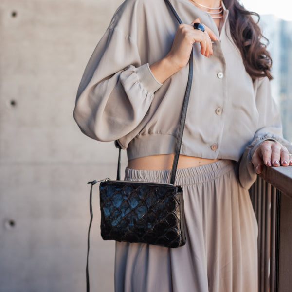 A frente é feita em couro de pirarucu, nossa especialidade. Conheça a Aruana e arrase nos mais variados lugares."