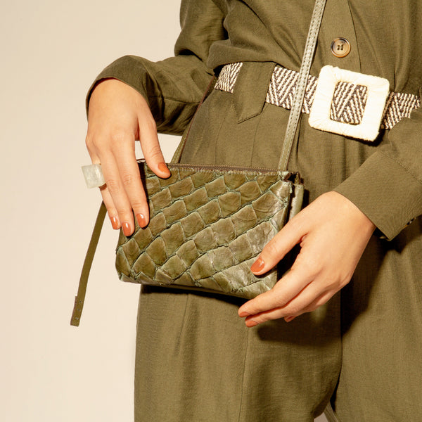 A frente é feita em couro de pirarucu, nossa especialidade. Conheça a Aruana e arrase nos mais variados lugares."