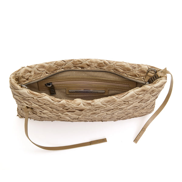 Com um design inteligente que une espaço e organização prática, a Aquira possui dois bolsos internos e um bolso externo, mantendo o essencial ao seu alcance com elegância. O couro de pirarucu, conhecido por sua resistência e beleza singular, faz desta peça um investimento em autenticidade e durabilidade, temporada após temporada.