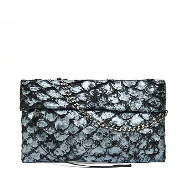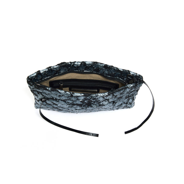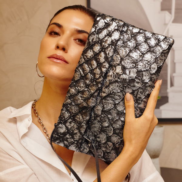 A Bolsa Aquira Maxi Clutch Preto com Prata é a expressão máxima do luxo discreto e da elegância atemporal. Com sua cor Preto com Prata, inspirada nos contrastes sofisticados entre o escuro profundo e o brilho metálico, essa peça é uma joia exclusiva para mulheres que valorizam o poder de um acessório sofisticado. Confeccionada em couro de pirarucu, cada detalhe da Aquira exala sofisticação, sendo ideal para eventos de gala, festas ou momentos que pedem um toque de glamour e distinção.
