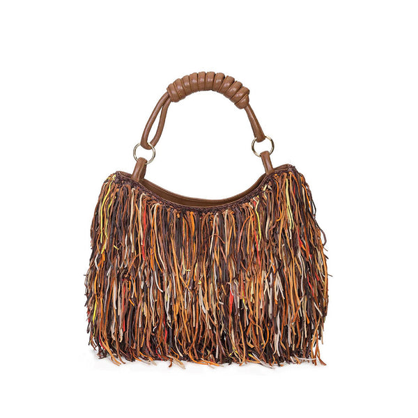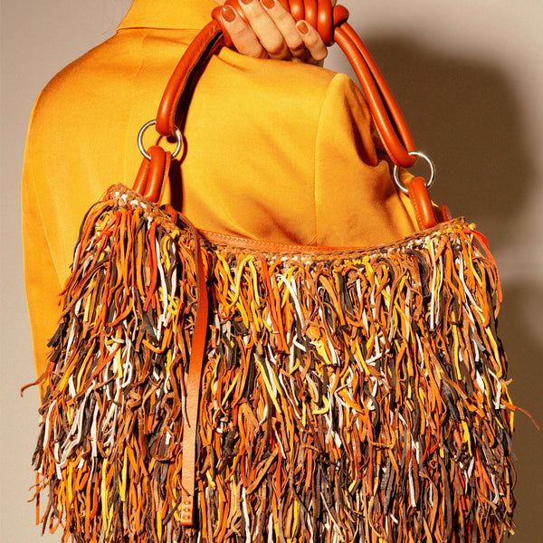 "Mais um clássico DG, a Bolsa Nanine é marcante! Feita em couro com frente em franjas, ela tem um mix de cores super elegante e atemporal.