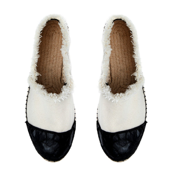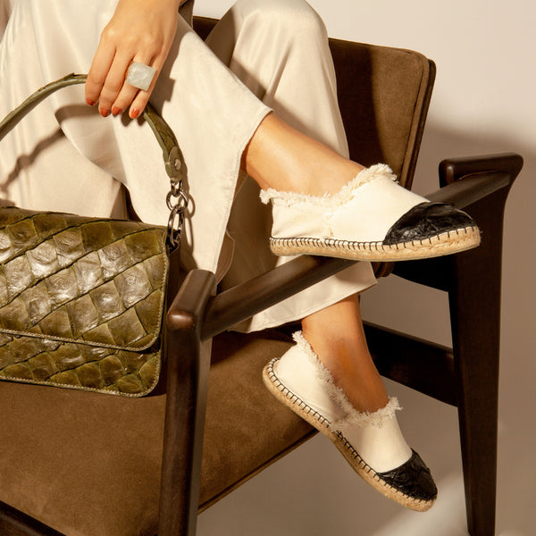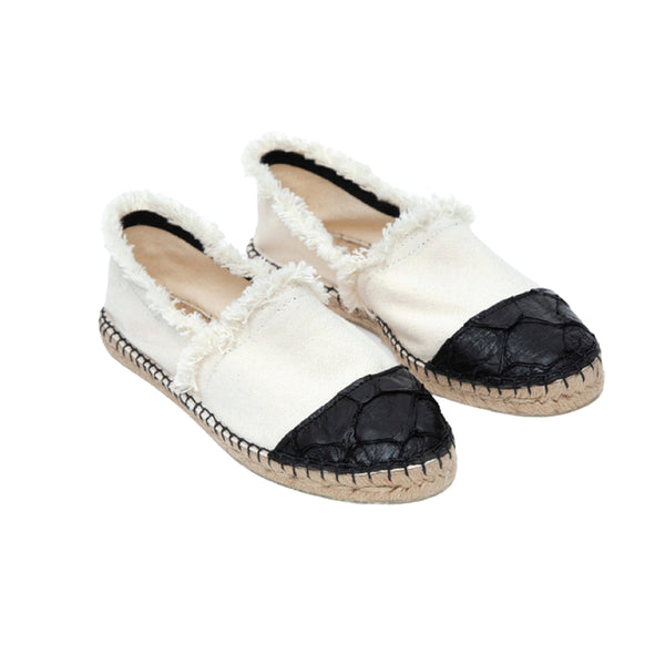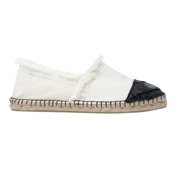 BOYRÁ - Alpargata em lona crua, com bordas desfiadas e biqueira em pirarucu. Cor Off-white/Preto