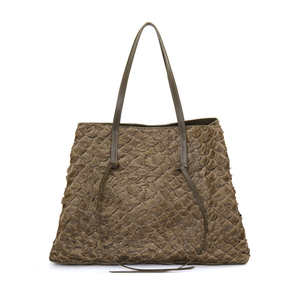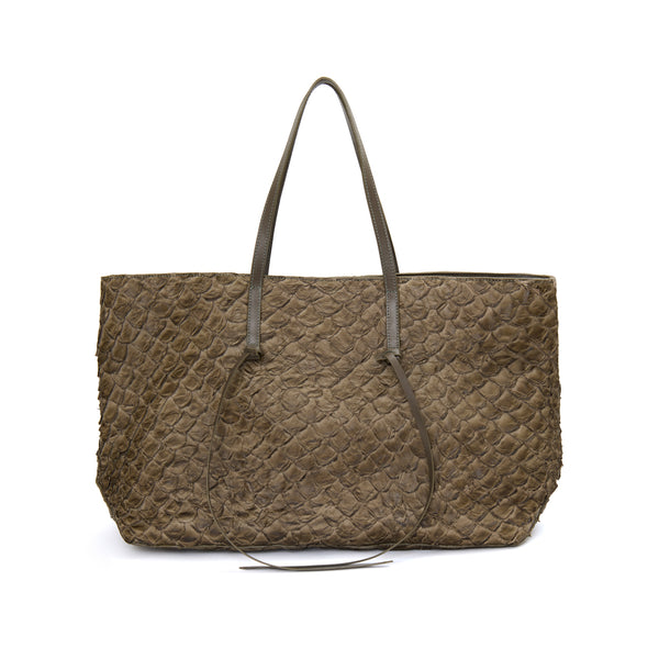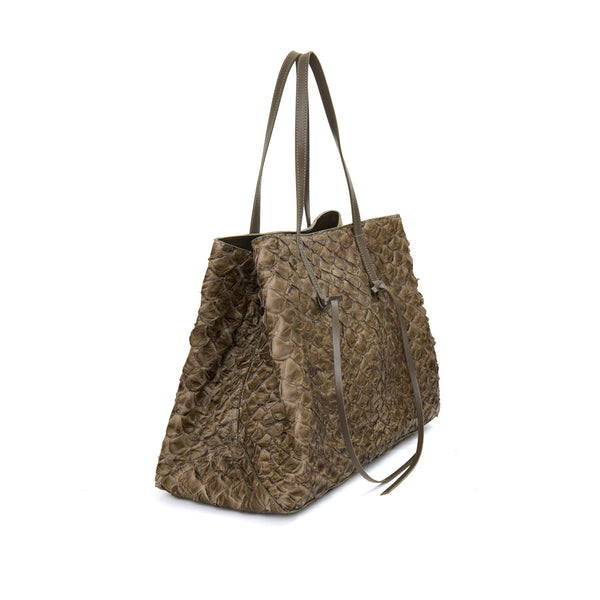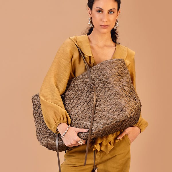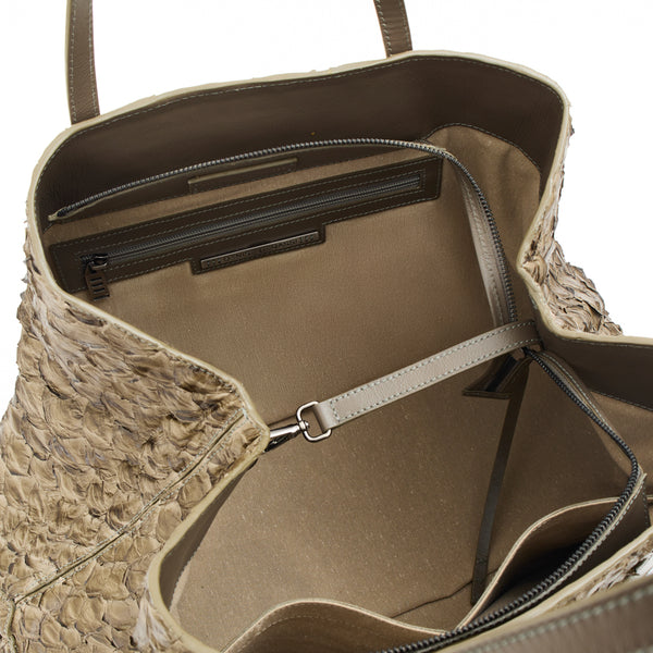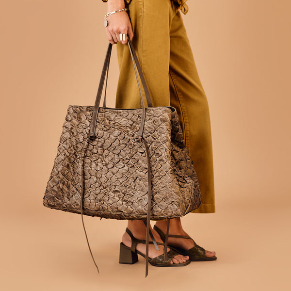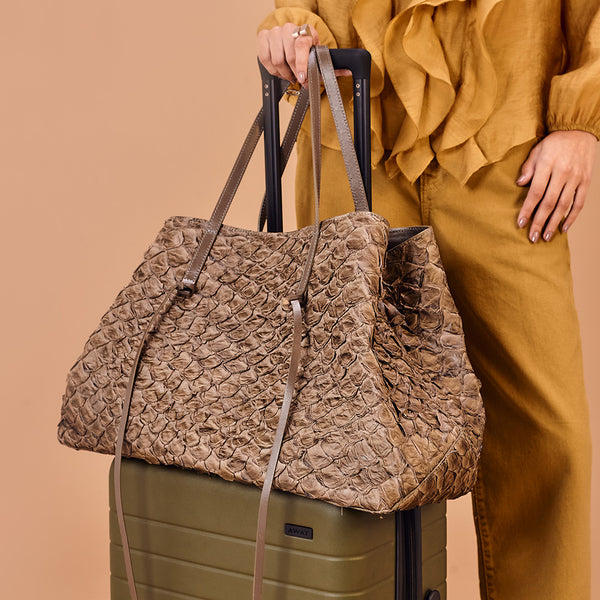 A Bolsa Cobé é mais do que um acessório, é um acontecimento! Uma shopper espaçosa, prática e belíssima que vai te acompanhar com tudo o que você precisa carregar: seja no seu dia a dia ou nas suas viagens mais especiais. Ela é confeccionada em nosso nobre e brasileiro couro de pirarucu, com alças em couro bovino. Ela pode ser usada toda aberta ou com as laterais contraídas através de um fechamento interno com mosquetão. A boca também possui um zíper, para maior segurança. As tiras de couro penduradas em suas alças são um detalhe estético mas podem também servir para você amarrar e manter as laterais presas, em seu modo compacto. Seu forro interno é feito em nosso tecido sustentável ,com bolsos amplos para você se manter organizada. E tem muito espaço para carregar tudo o que você precisa! Use a mala de bordo como apoio e carregue a sua Cobé pelo mundo! A escolha ideal para momentos descontraídos que também exigem praticidade, em que espaço é essencial para carregar muita coisa. Elegância e sofisticação são indispensáveis. Feita para mulheres que sabem valorizar o design nacional e não tem medo de ousar!