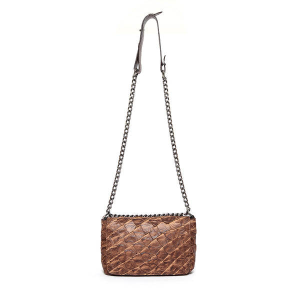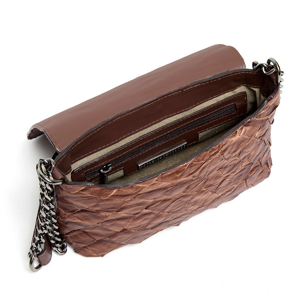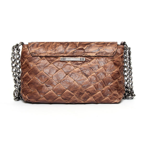 Ela é feita em couro de pirarucu, com uma tampa fechada por ímã e tem um shape clássico ao mesmo tempo que super atual. Diversas possibilidades de composições podem ser feitas com esta bolsa que virou um ícone Denise Gerassi.