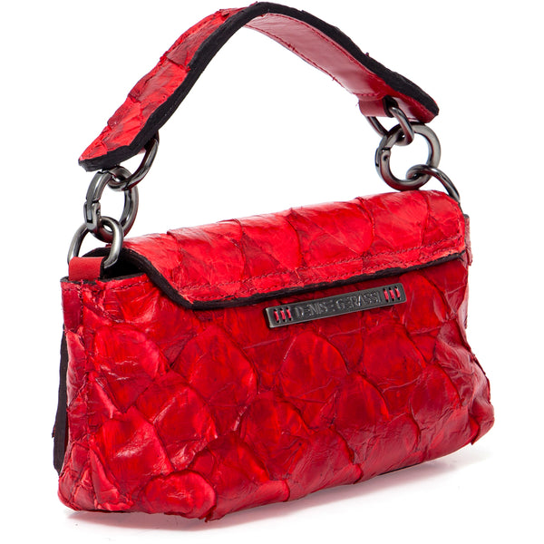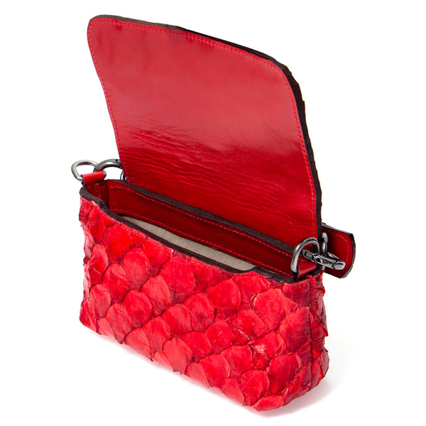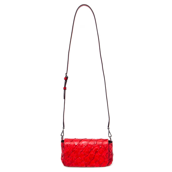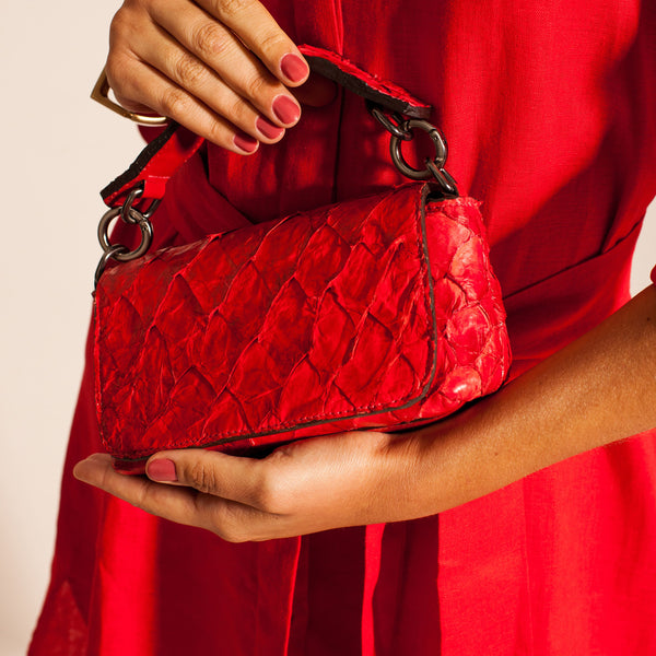 A mini handbag Huari é puro charme! Toda em couro de pirarucu, tem tamanho e design ideal para trazer para um look sofisticado ou despojado graça e elegância. Possui também uma alça adicional em couro liso para uso na transversal. As alças são removíveis, podendo ser usadas em conjunto ou separadamente. O forro é feito em tecido sustentável na cor fendi. Seus metais são em banho onix. DG320/04. Dimensões: A 10 X L 20 X P 07