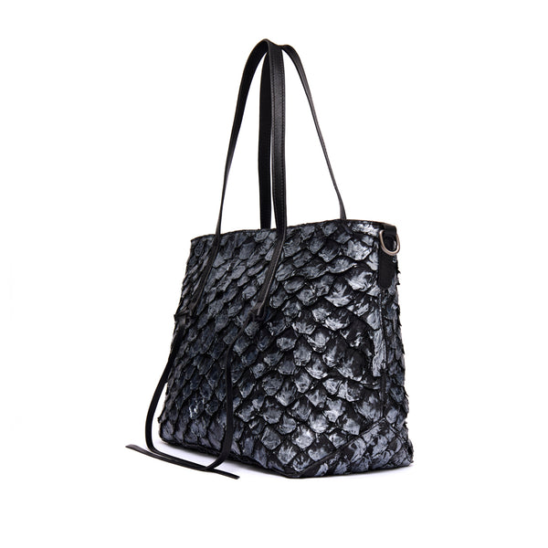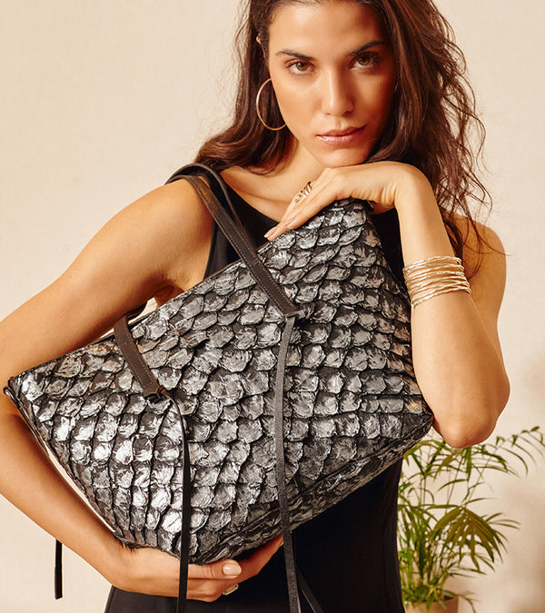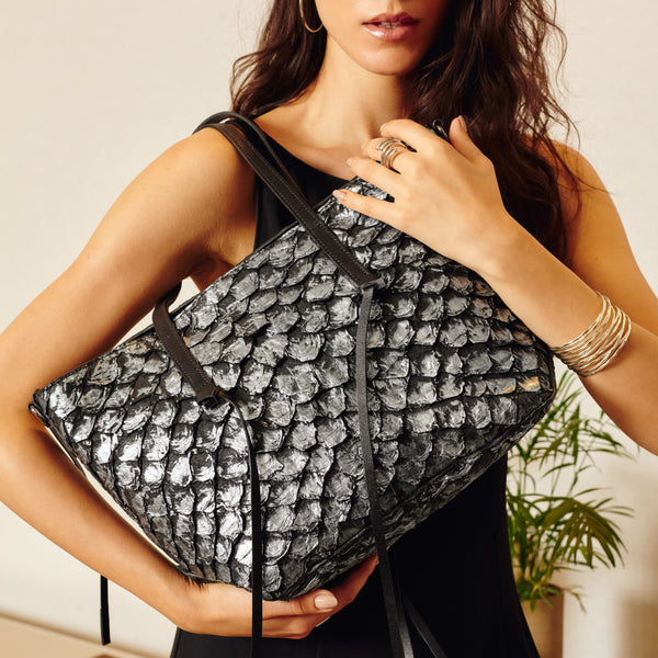 Luna - Shopper em couro de pirarucu Preto com Prata