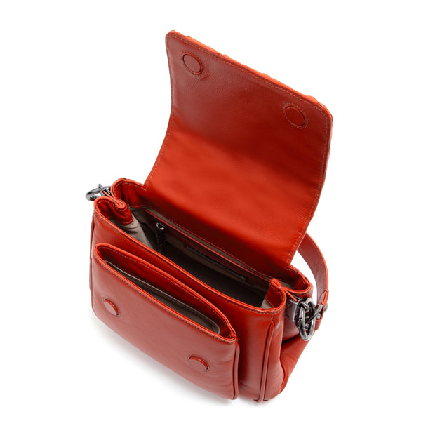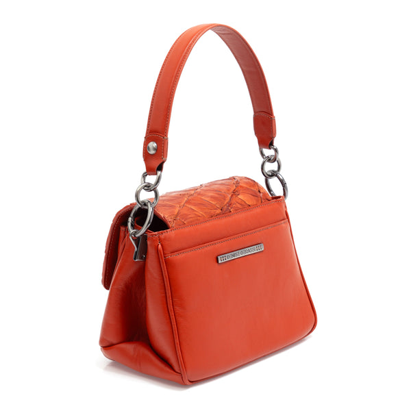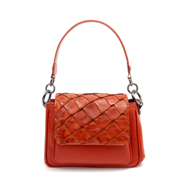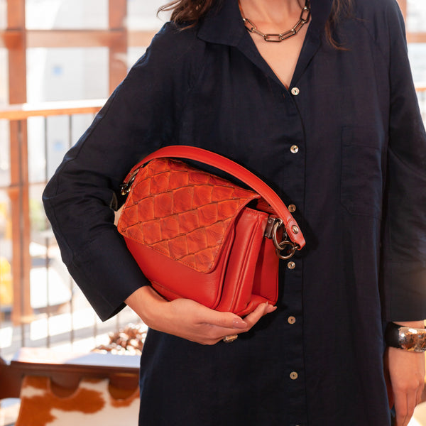 A handbag Moara, era a bolsa que faltava em sua coleção! A tampa frontal em couro de pirarucu, confere a sofisticação dessa peça. Seu amplo espaço interno com dois compartimentos, permite acomodar e organizar todos os seus itens. Possui bolso externo na parte posterior para o celular. Seu design é especial e elegante por todos os ângulos que você olhar. Tem duas alças, uma curta e outra longa para transversal, que podem ser usadas juntas ou separadamente. Fechamento com botões imã e metais em banho onix. DG325/01 - Dimensões: A 20 cm X L 24 cm P 16 cm Peso: 800g Cor: Telha |