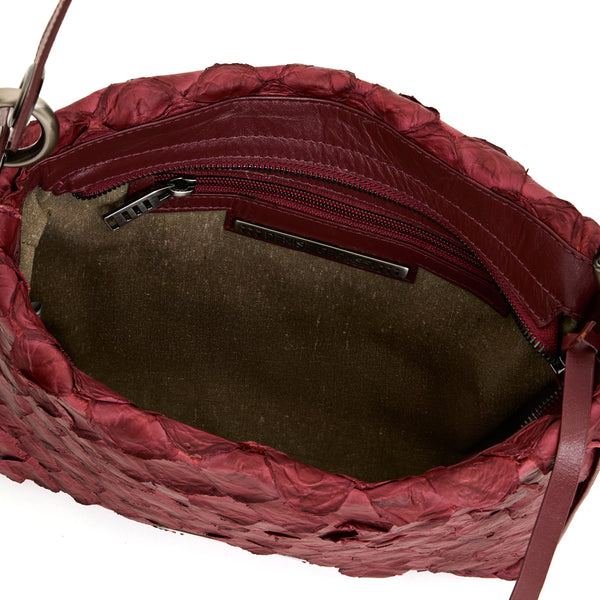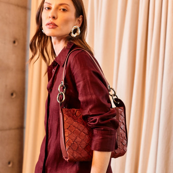 Confeccionada em couro de pirarucu, nosso mais brasileiro e nobre dos materiais, ela une elegância, praticidade e a sofisticação inerente aos produtos Denise Gerassi. Seu design não apenas atrai os olhares, mas também traz informação de moda a qualquer look: seja para ocasiões específicas ou para te acompanhar durante todo o dia. A textura única do couro de pirarucu, com toque e brilho distintos, garante que cada peça seja singular - uma das belezas da natureza. Por dentro ela é super funcional: com um espaço cuidadosamente projetado que acomoda seus pertences com praticidade. Os detalhes em couro bovino e os acabamentos metálicos complementam o design num mix de texturas único.