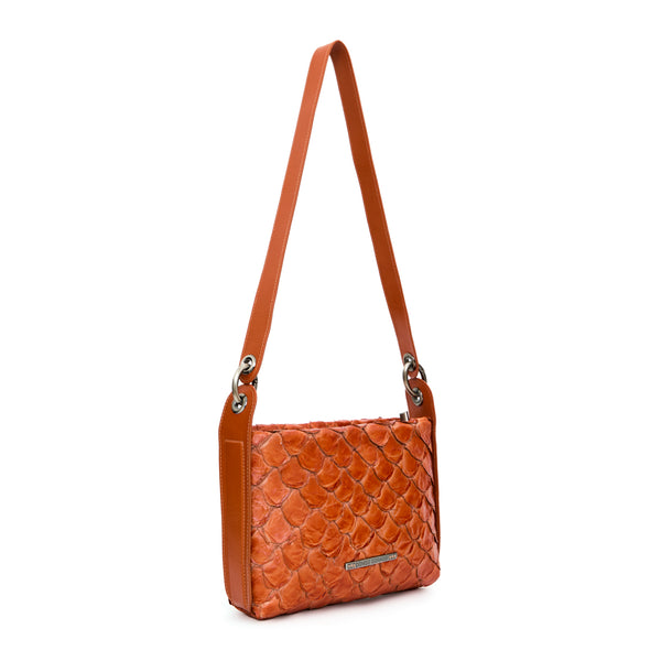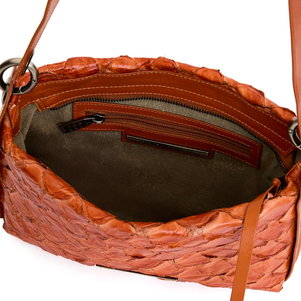 Confeccionada em couro de pirarucu, nosso mais brasileiro e nobre dos materiais, ela une elegância, praticidade e a sofisticação inerente aos produtos Denise Gerassi. Seu design não apenas atrai os olhares, mas também traz informação de moda a qualquer look: seja para ocasiões específicas ou para te acompanhar durante todo o dia. A textura única do couro de pirarucu, com toque e brilho distintos, garante que cada peça seja singular - uma das belezas da natureza.Por dentro ela é super funcional: com um espaço cuidadosamente projetado que acomoda seus pertences com praticidade. Os detalhes em couro bovino e os acabamentos metálicos complementam o design num mix de texturas único.